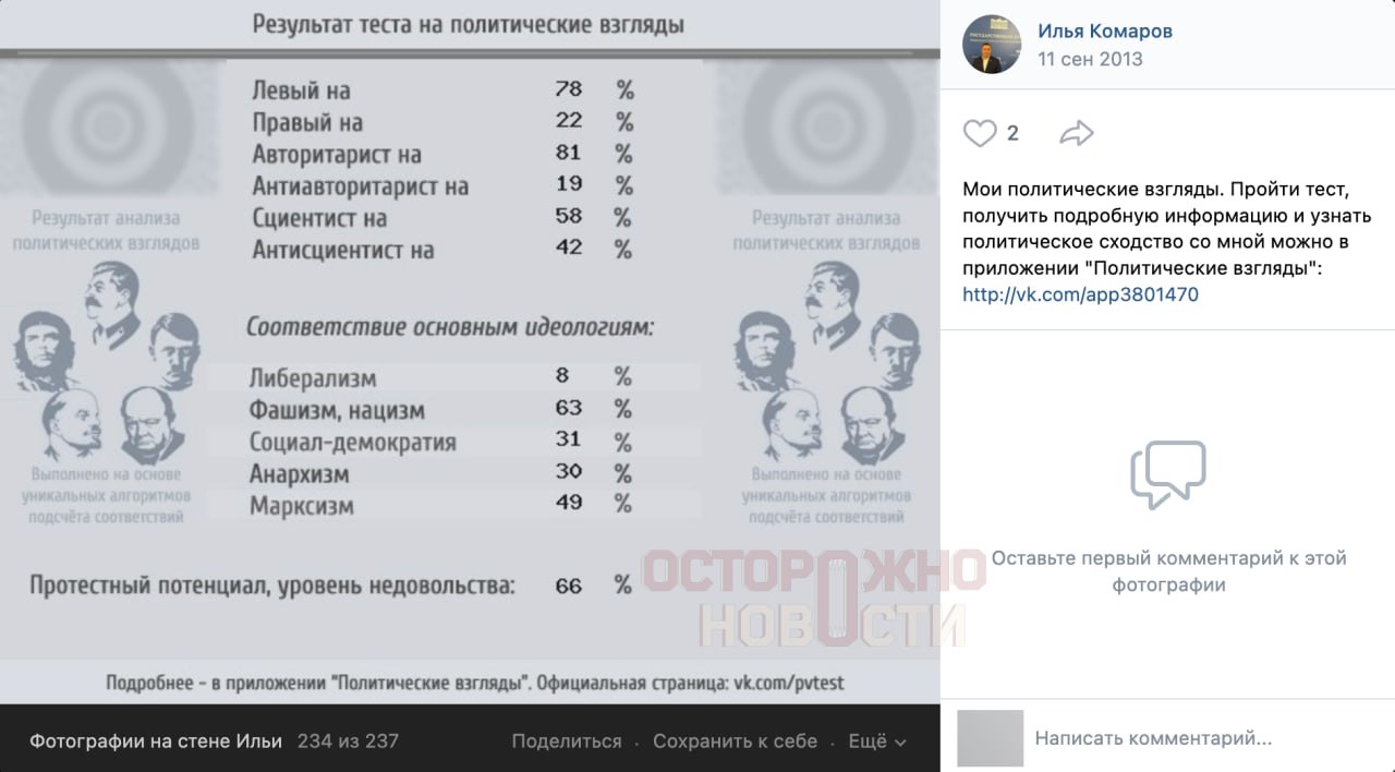 Журналисты изучили страницу Комарова, чтобы понять, что могло привлечь внимание правоохранительных органов, и в обозначенный в судебном решении период нашли только скриншот теста на политические взгляды, опубликованный Комаровым во «ВКонтакте» в сентябре 2013 года. Результат теста показал, что политик на 78 процентов относится к левым взглядам, на 81 процент — к авторитарным, а ближайшей идеологией указаны «фашизм, нацизм». В решении суда речь идёт об изображении двух «чёрных солнц», которые суд признал нацистской символикой. Возможно, они также были на скриншоте, который сохранился у Комарова.