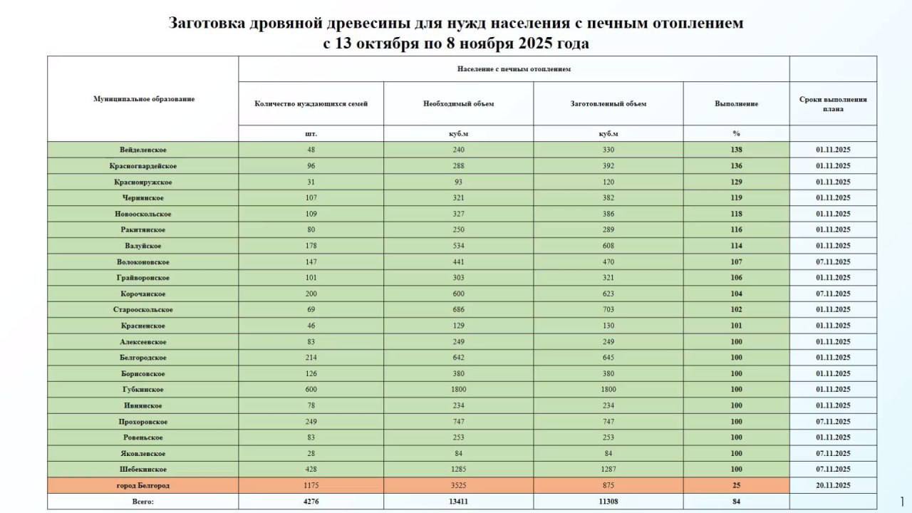 Практически все муниципалитеты региона перевыполнили план по заготовке дров. Так, Вейделевский муниципалитет заготовил 138 процентов дров от изначального плана, Красногвардейский — 136 процентов, а Краснояружский — 129 процентов. Работа по заготовке не завершена лишь в Белгороде: заготовлено только 25 процентов дров от всего объёма, в которых нуждаются 1175 семей.