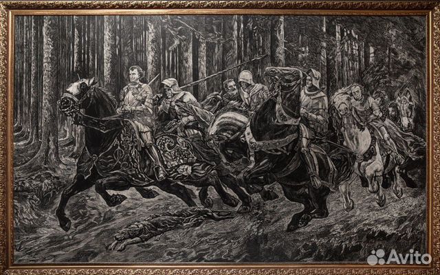 Уникальную картина «Карл Смелый. Кавалькада» авторства Владимира Зимницкого можно купить за 4,8 миллиарда рублей на Авито. Художественное произведение размером 150 на 300 сантиметров выполнено в редкой технике резцовой гравюры по дереву.