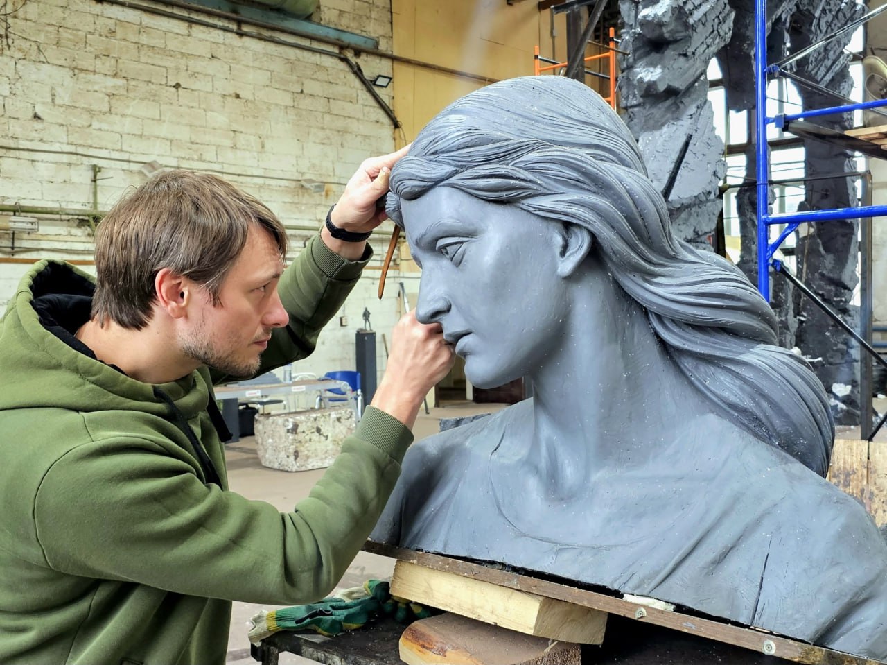 Художник показывает в соцсетях как поэтапно идёт работа над скульптурой. Сначала отливают отдельные фрагменты, некоторые весят несколько центнеров, затем их тщательно прорабатывают и собирают в единую композицию.