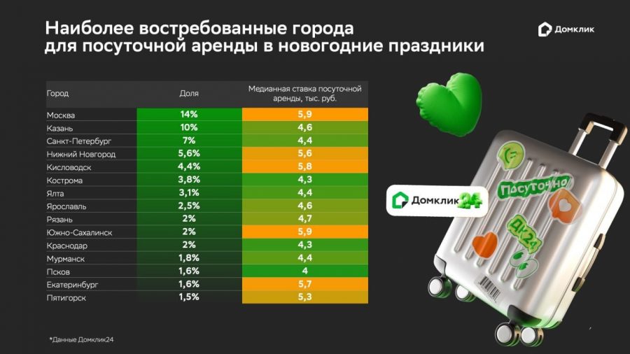 Аналитики «Домклик» оценили спрос на посуточную аренду к Новому году