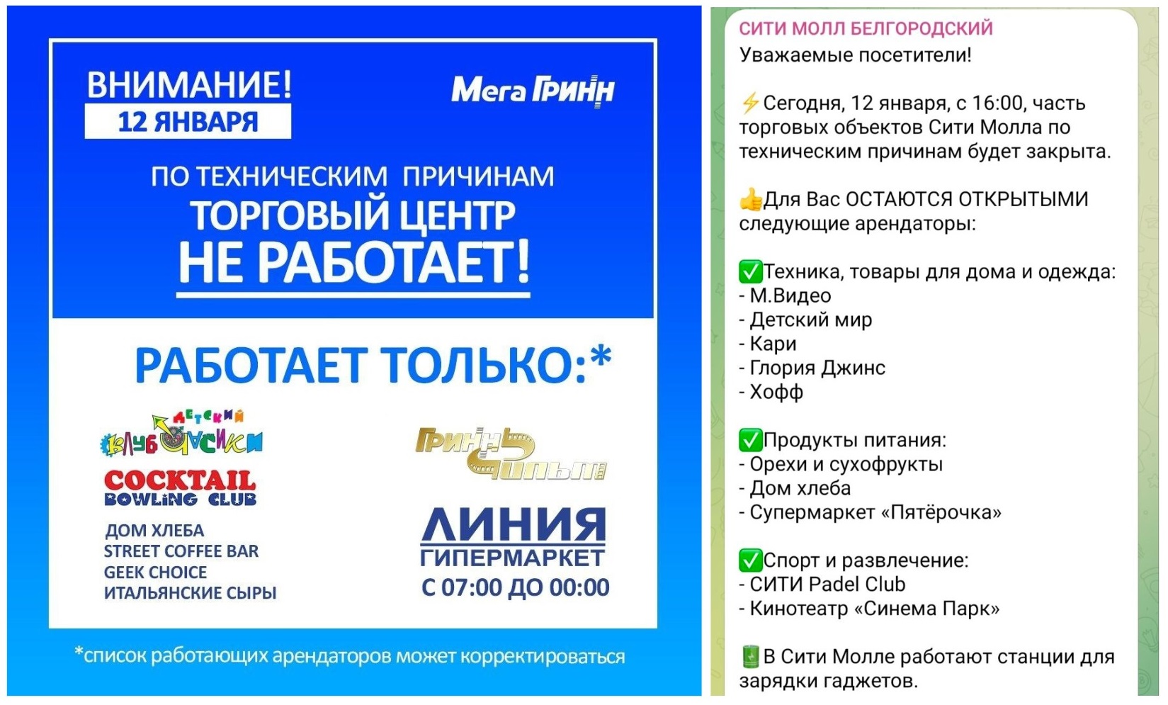 Стоит отметить, что проблемы с работой торговых точек сохраняются и спустя три дня после ударов по энергоинфраструктуре. Крупные торговые центры Белгорода — «Рио», «Сити Молл» и «Мега Гринн» — 12 января работают с ограничениями или не работают вовсе, о чём сообщают в своих телеграм-каналах.