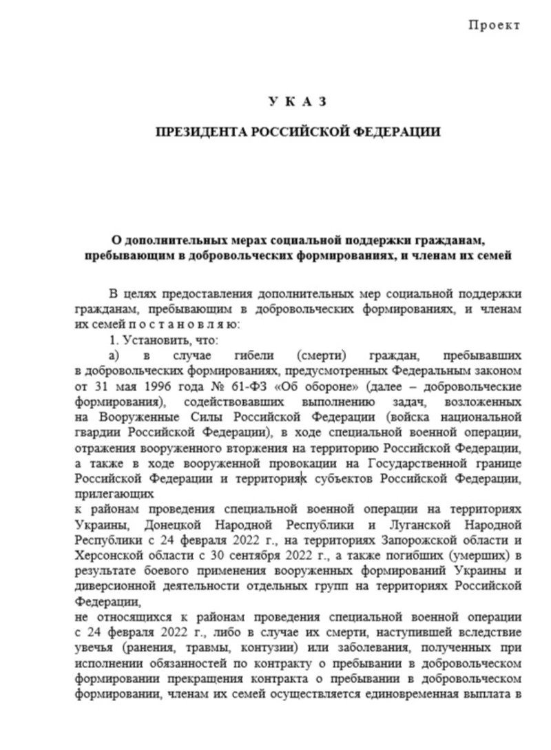 Министерство обороны РФ подготовило проект указа президента «О дополнительных мерах социальной поддержки гражданам, пребывающим в добровольческих формированиях, и членам их семей». Соответсвующий документ размещён на Федеральном портале проектов нормативных правовых актов.