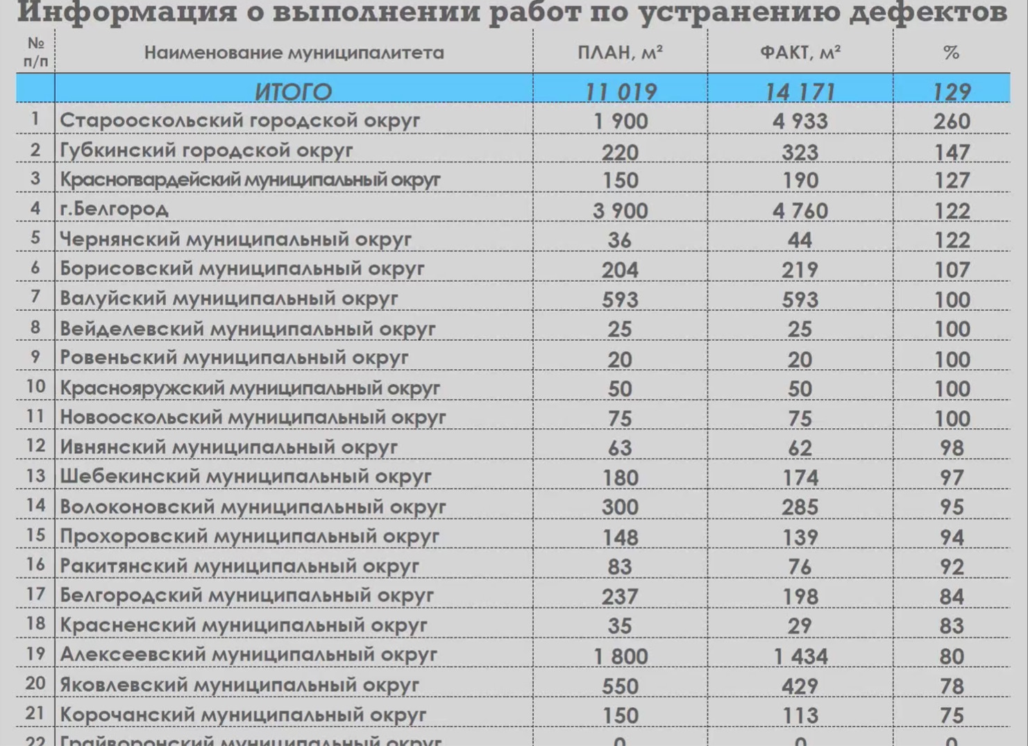 На заседании правительства Белгородской области министр автомобильных дорог и транспорта Сергей Евтушенко отчитался о ходе ямочного ремонта. Цифры выглядят противоречиво: с одной стороны, план перевыполнили (отремонтировали 14,2 тысячи квадратов — 129 процентов от запланированного), с другой — реальный объём работ оказался намного больше.