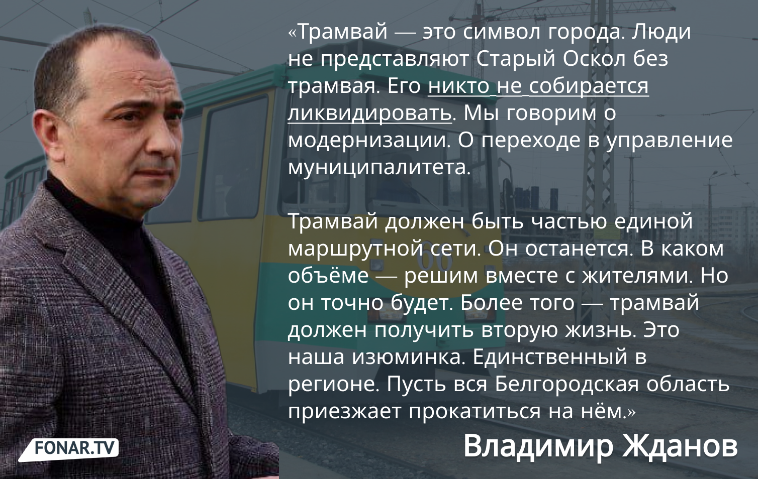 — Трамвай — это символ города. Люди не представляют Старый Оскол без трамвая. Его никто не собирается ликвидировать. Мы говорим о модернизации. О переходе в управление муниципалитета. Трамвай должен быть частью единой маршрутной сети. Он останется. В каком объёме — решим вместе с жителями. Но он точно будет. Более того — трамвай должен получить вторую жизнь. Это наша изюминка. Единственный в регионе. Пусть вся Белгородская область приезжает прокатиться на нём. Думаем, как сделать его частью туристического маршрута, — делился планами чиновник.