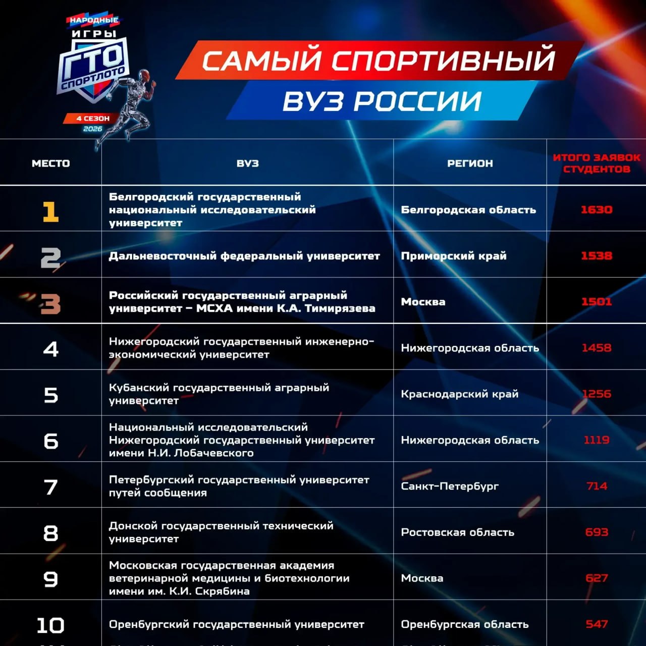 Ранее вуз шесть раз становился чемпионом Всероссийского фестиваля ГТО среди студентов. Амбассадор «Народных Игр ГТО», победитель третьего сезона шоу «Титаны» на ТНТ, четырёхкратный чемпион Всероссийского фестиваля ГТО в составе команды университета Кирилл Бельский отметил, что вуз является лучшим среди университетов в спорте в России.