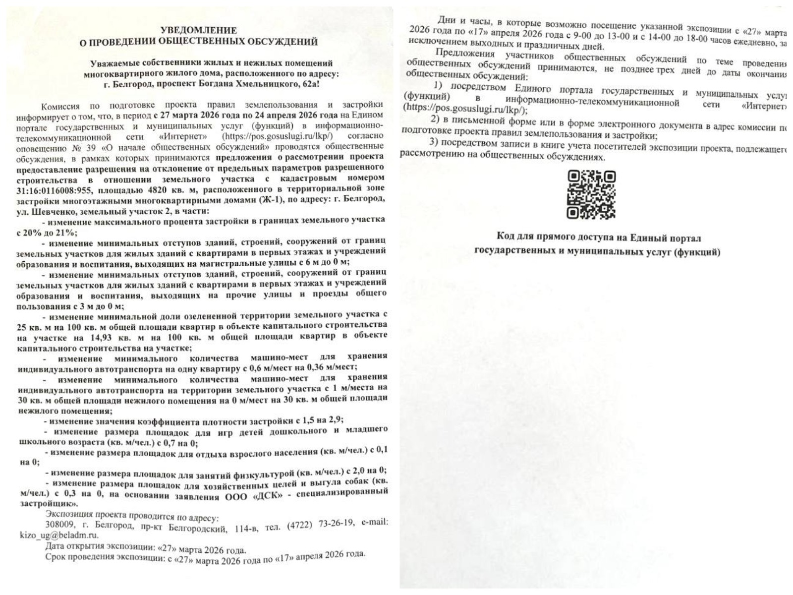 Общественные обсуждения начались 27 марта и продлятся до 24 апреля. Ознакомиться с проектом жители могут на экспозиции по адресу: Белгород, проспект Белгородский, 114-в, или на портале «Госуслуги» по ссылке.