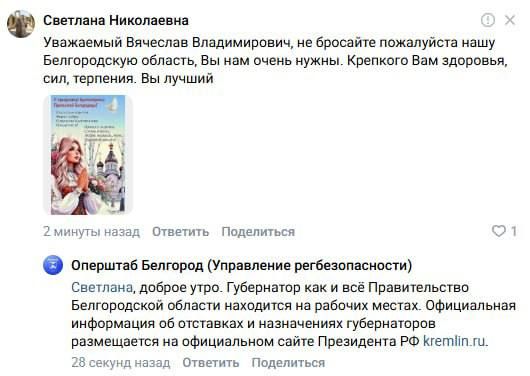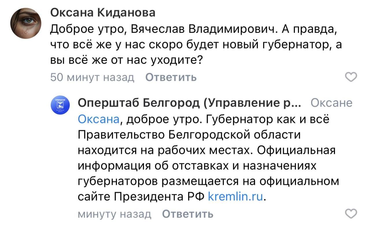— Губернатор, как и всё правительство Белгородской области, находится на рабочих местах. Вся информация об отставках и назначениях губернатора размещается на официальном сайте Президента РФ, — ответил оперштаб на комментарии на странице Гладкова ВКонтакте.