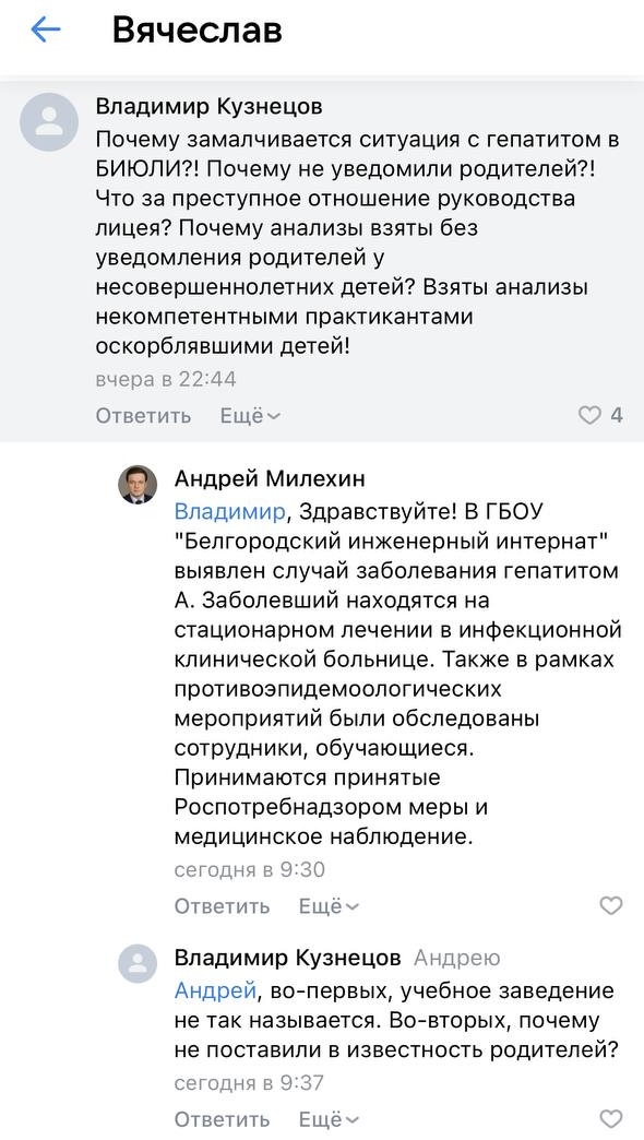 Один из родителей оставил возмущённый комментарий на странице губернатора Белгородской области Вячеслава Гладкова во «ВКонтакте». Он поинтересовался, почему замалчивают ситуацию с гепатитом в лицее, почему не уведомили родителей, почему анализы у несовершеннолетних детей брали без их согласия.