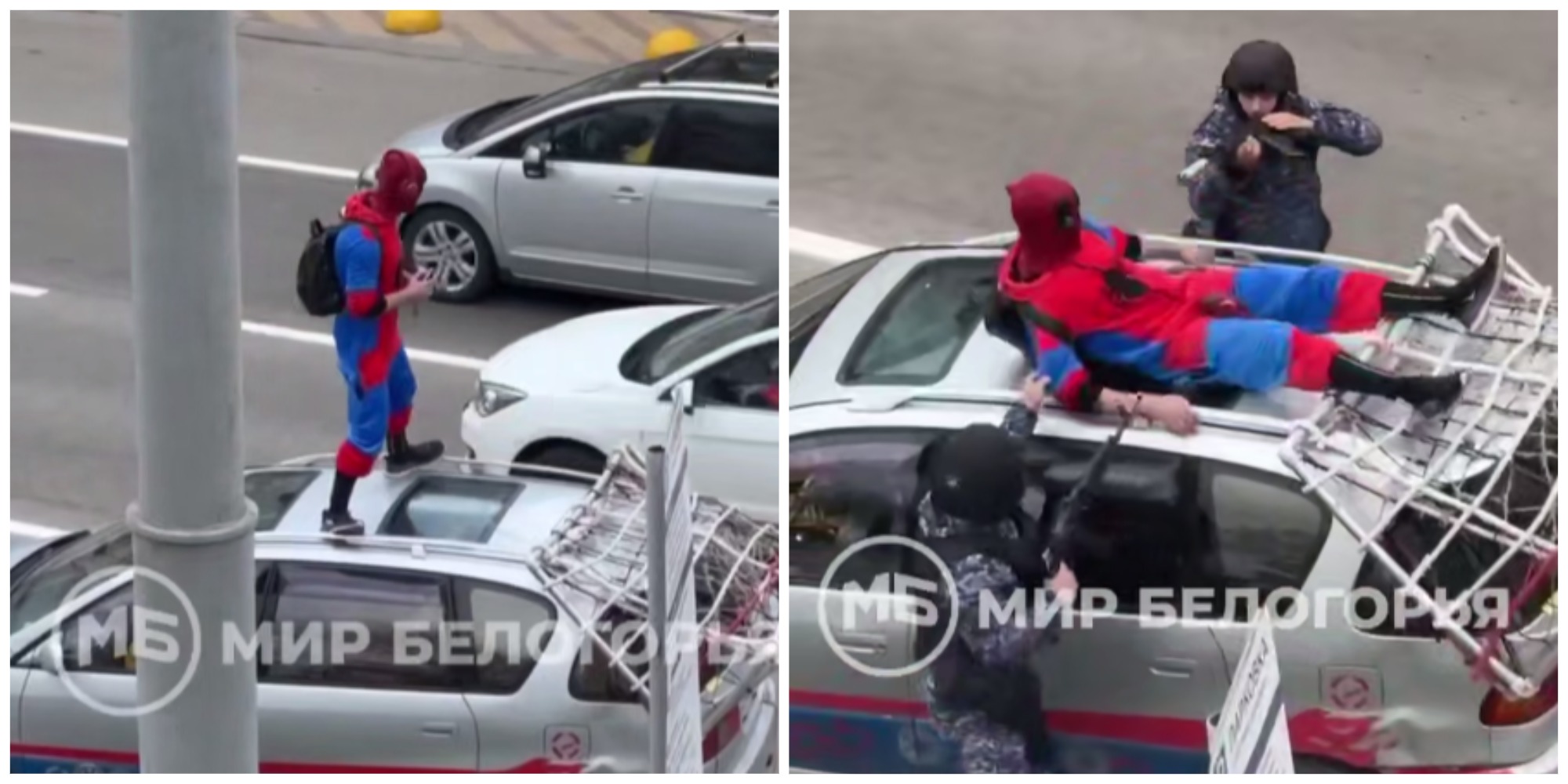 Белгородец в костюме Человека-паука прыгал по машине с зажигалкой, похожей на пистолет — его остановила Росгвардия