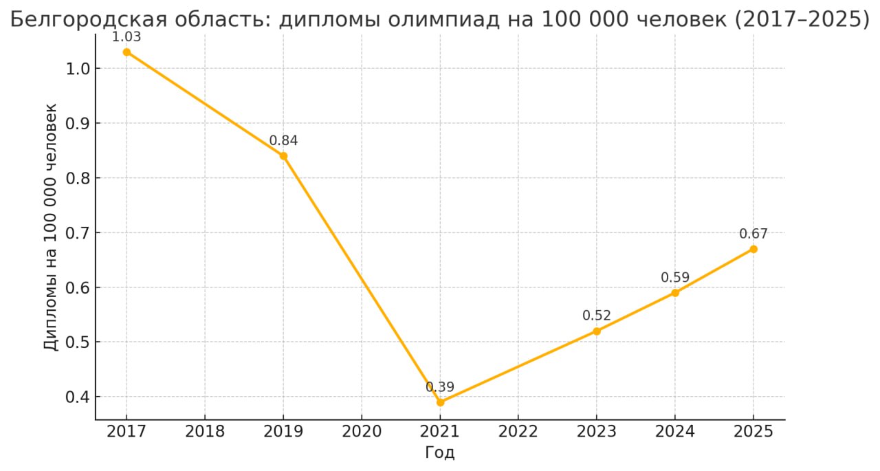Белгородская область оказалась на 44-м месте из 79 с результатом 0,67 дипломов на 100 тысяч человек по результатам школьников на всероссийских олимпиадах. При этом наш регион улучшил показатели по сравнению с 2024 годом — тогда количество дипломантов составляло 0,59 на 100 тысяч человек, хотя место в рейтинге за год не поменялось.