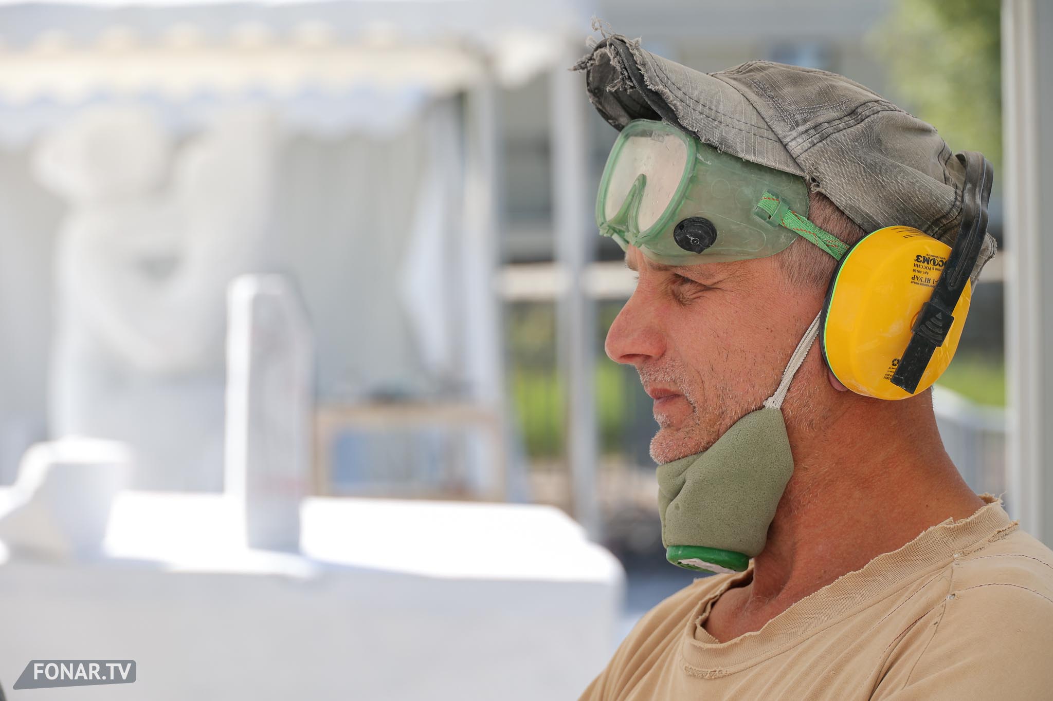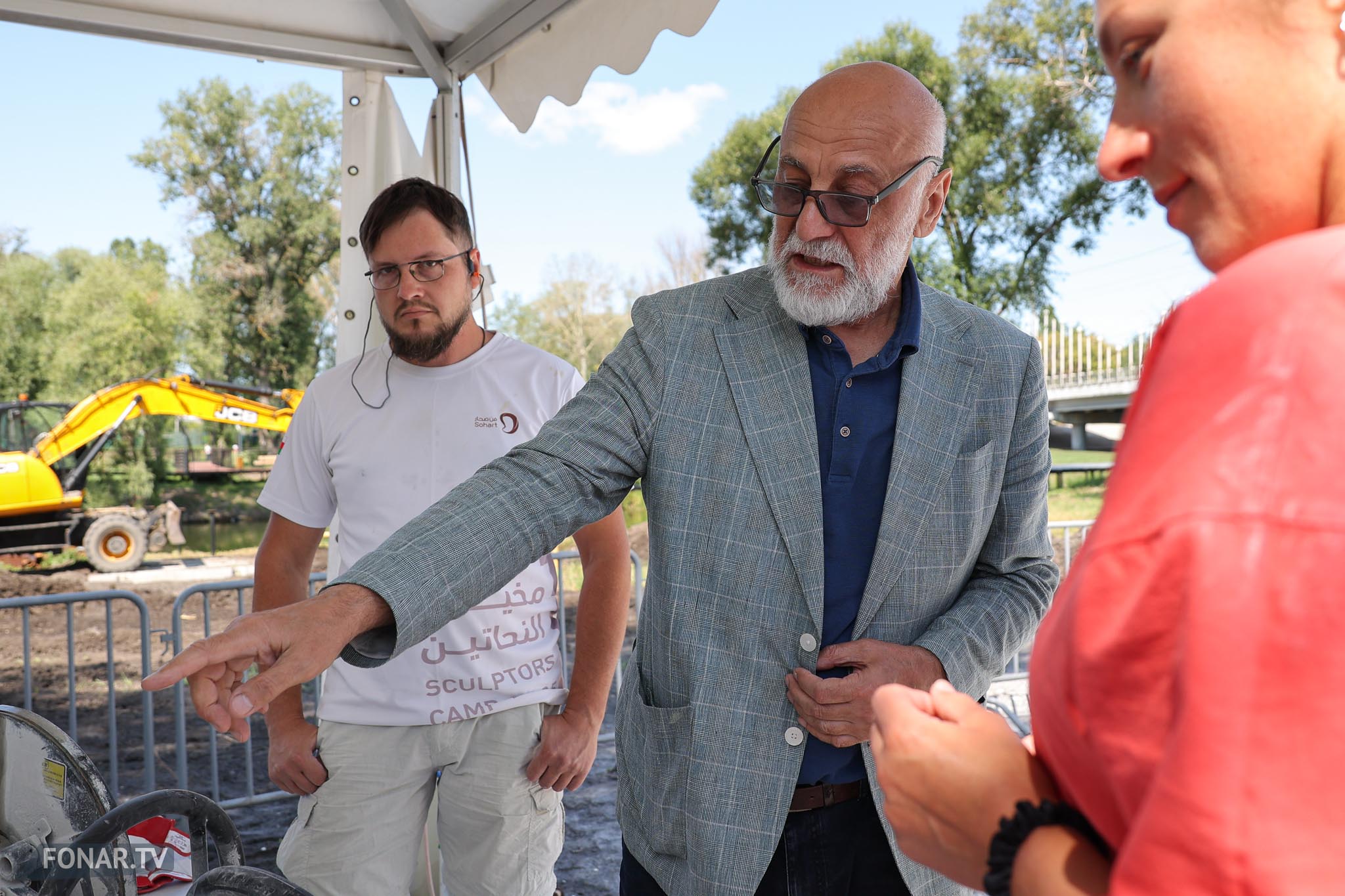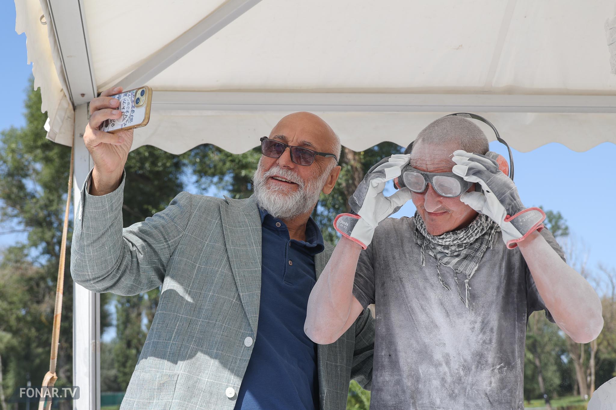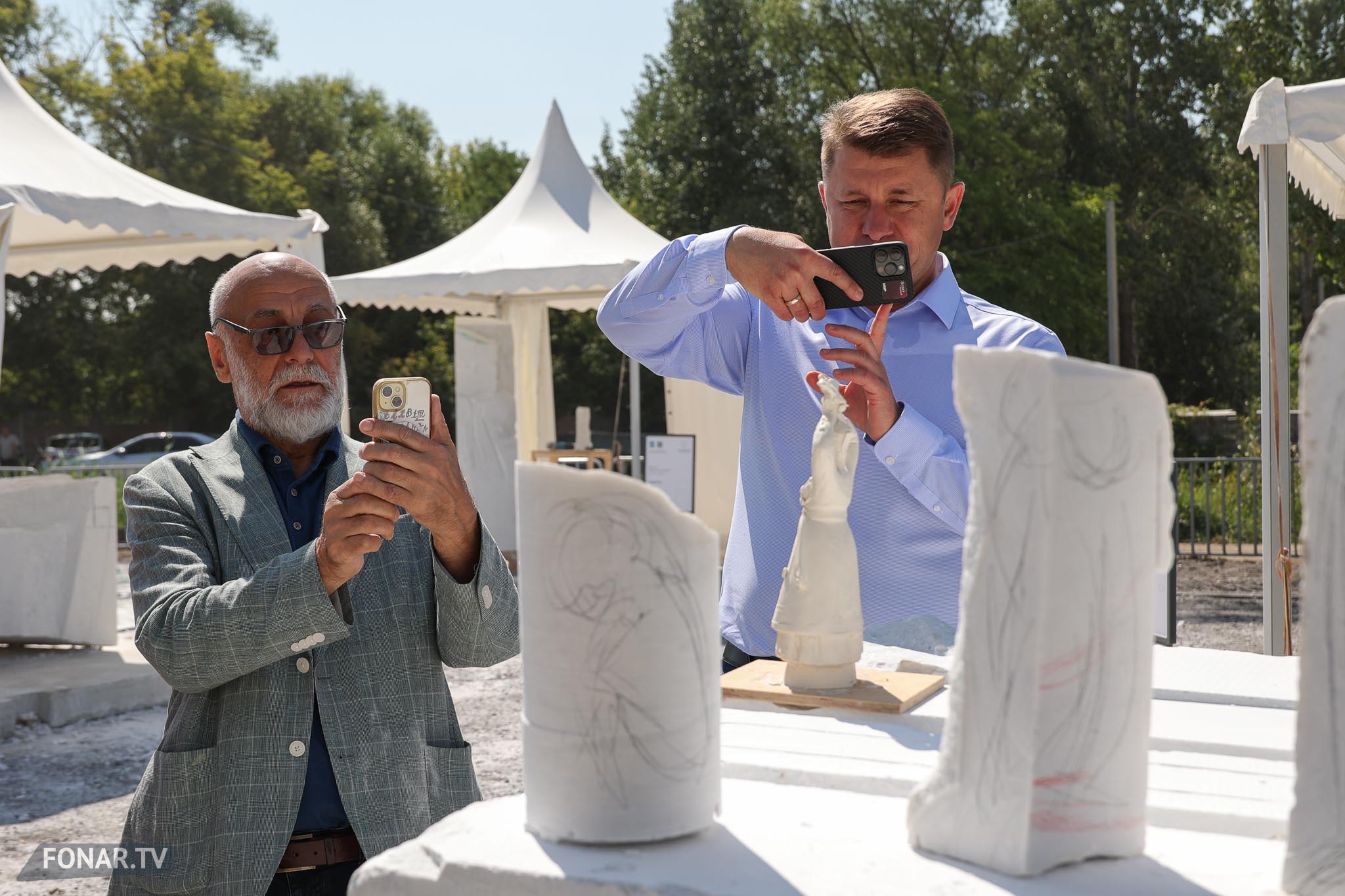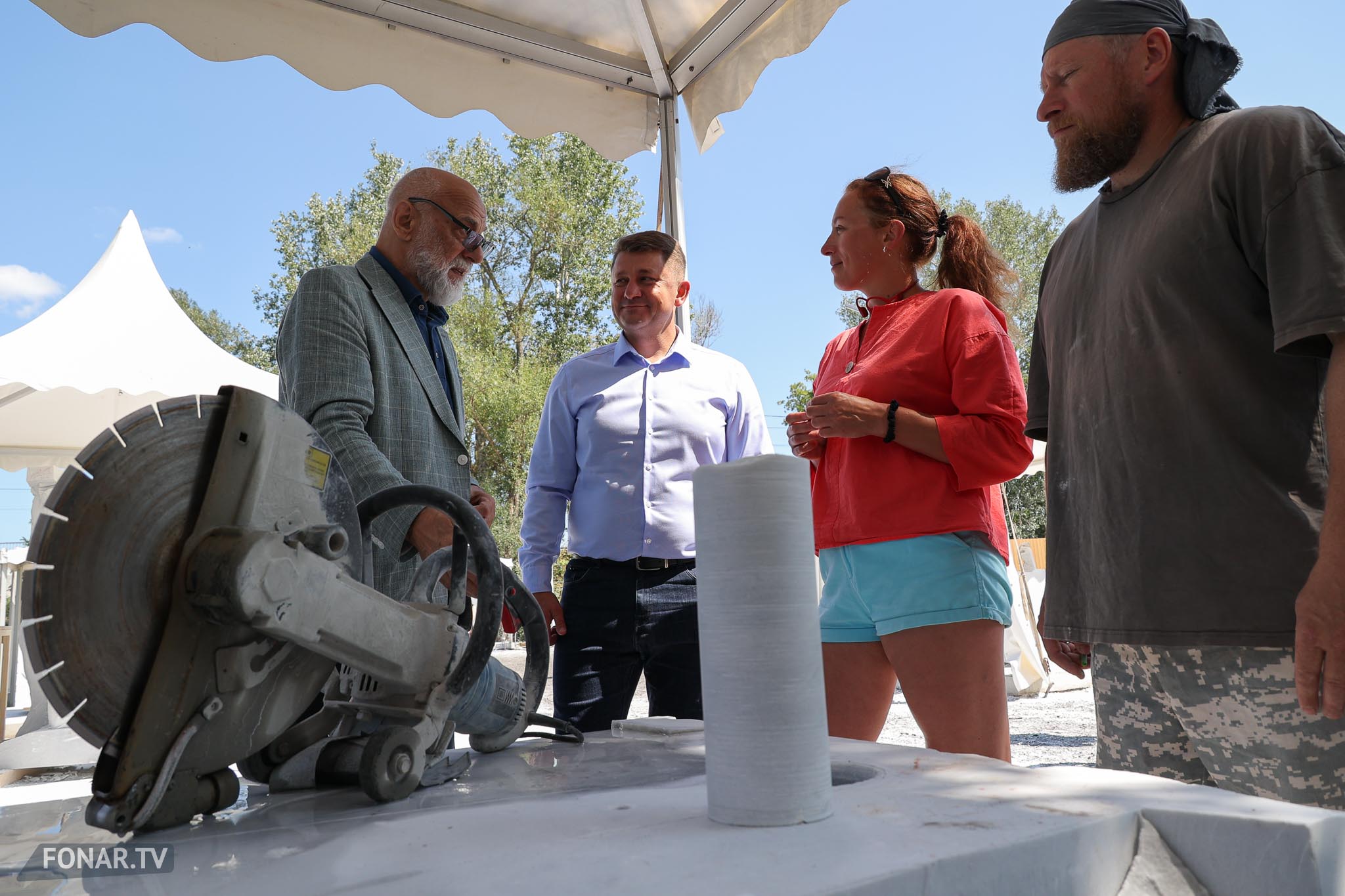 Гости и кураторы побывали на площадке, пообщались со скульпторами и даже сделали памятные фотографии с каждым мастером, несмотря на пыль, которая всегда сопровождает работу с камнем. Мэр Валентин Демидов лично оставил свой след на одной из моделей, дополнив аккуратным сердцем надпись «Белгород». Другому произведению он помог аккуратно отсечь несколько деталей по совету автора.