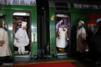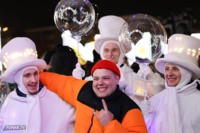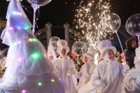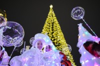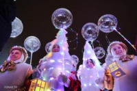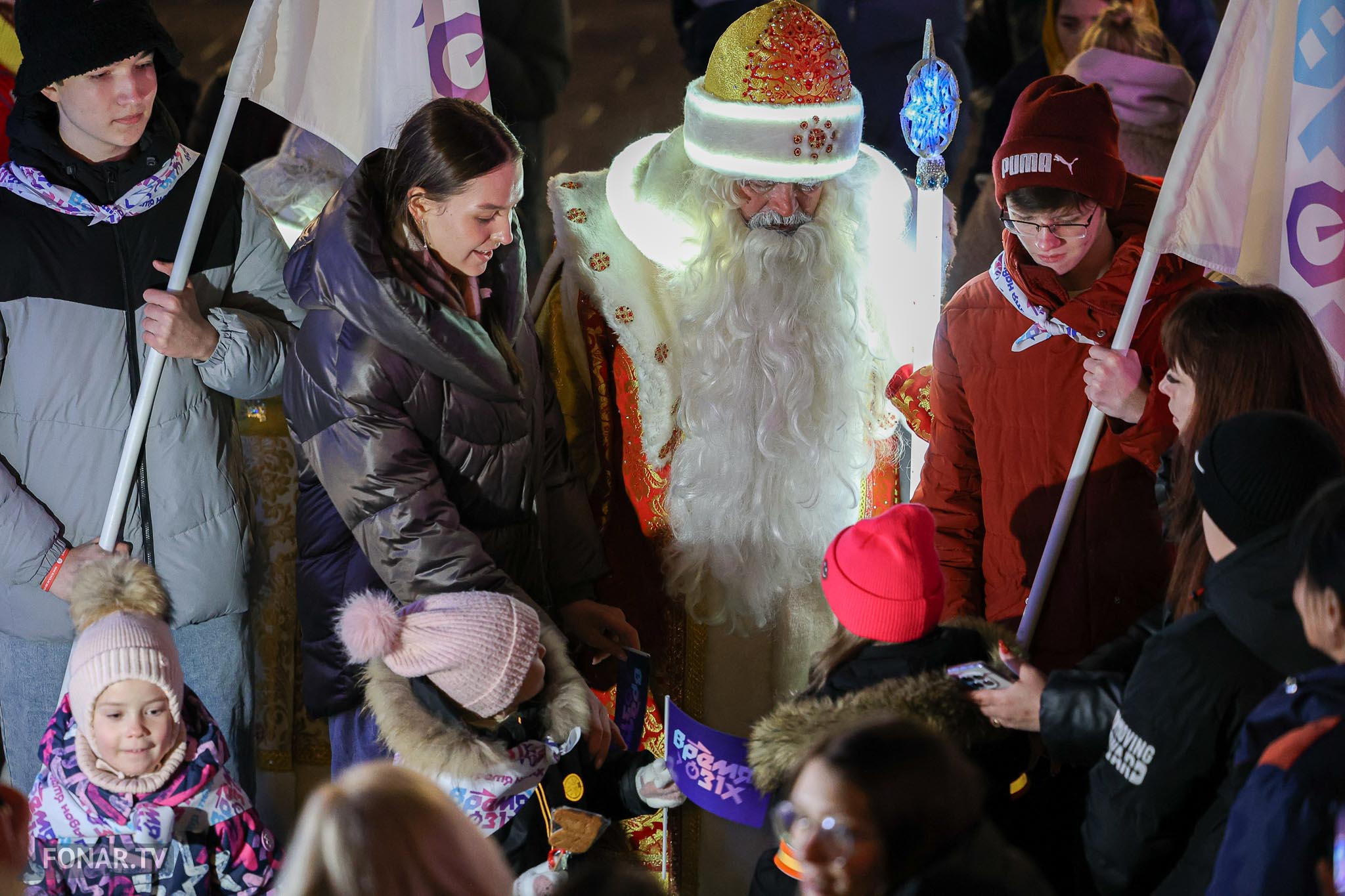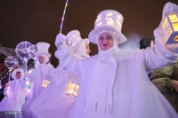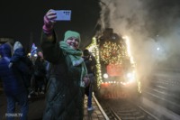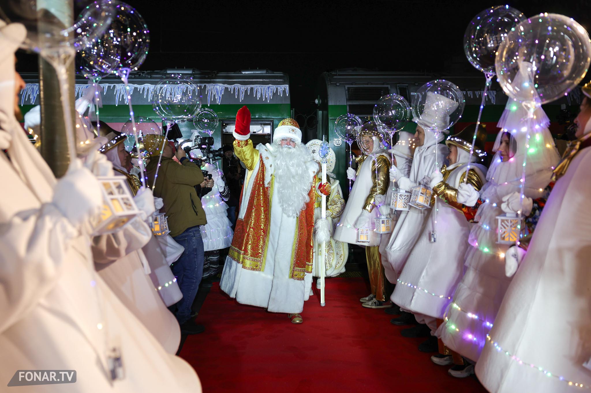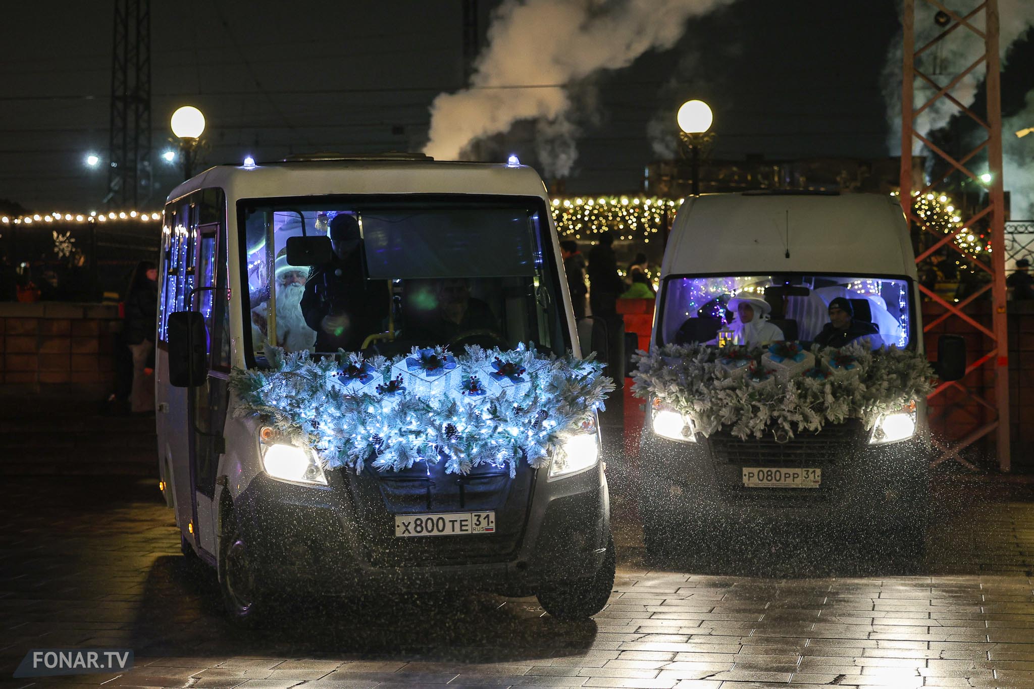 Наконец на украшенном ретропоезде прибыл Дед Мороз: сначала из вагона вышли его «сказочные помощники» — снеговики с фонариками и живые «новогодние ёлки». Затем появился и главный волшебник со Снегурочкой, как положено. Дед Мороз поприветствовал белгородцев и сообщил, что прямо сейчас поедет на Соборную площадь, чтобы зажечь главную ёлку региона.
