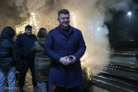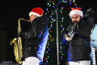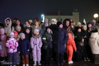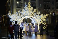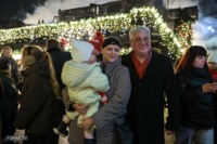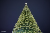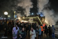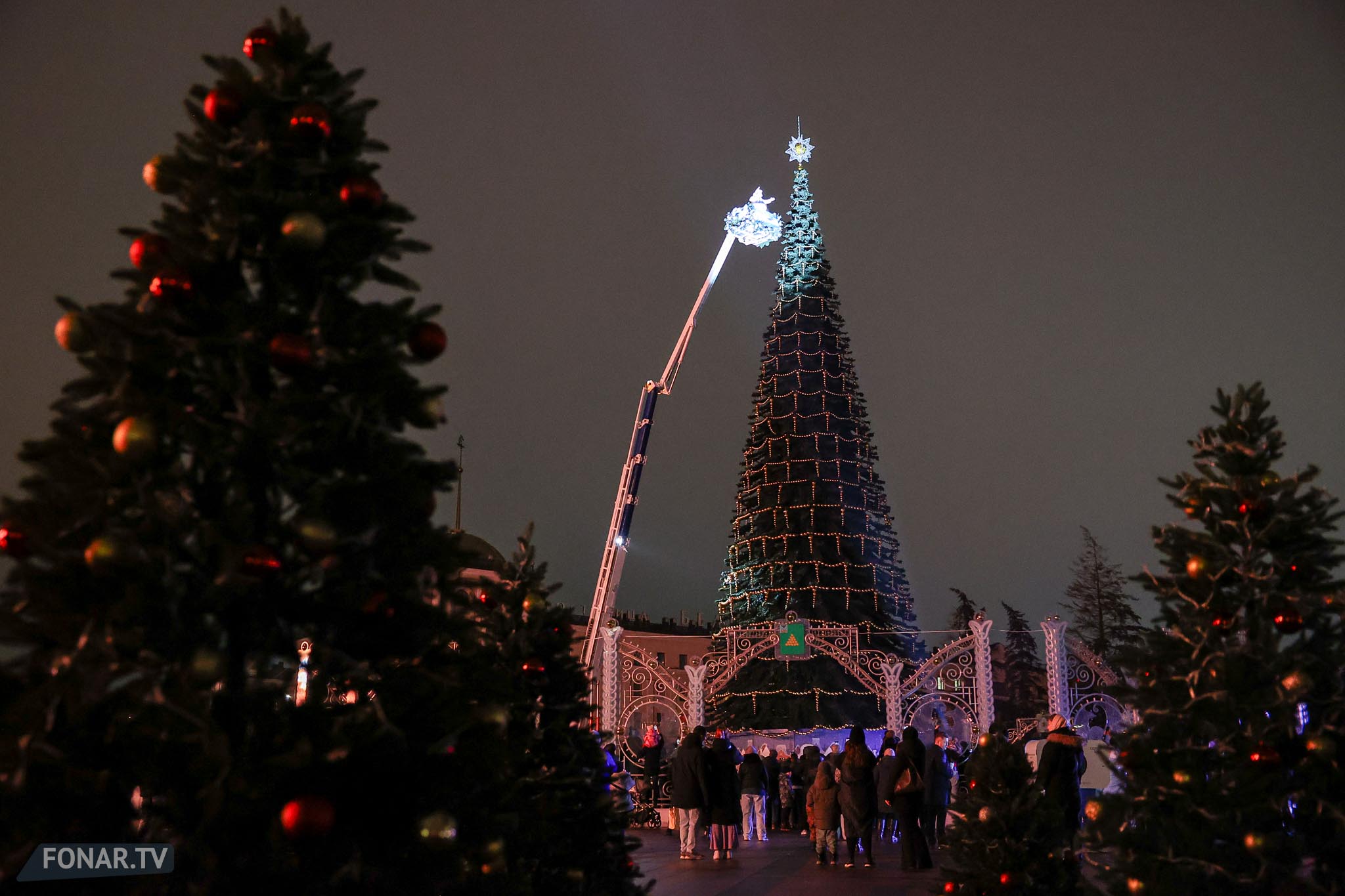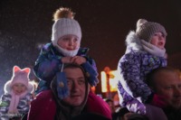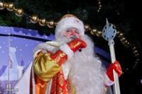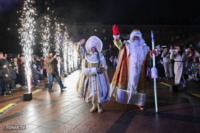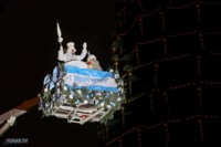 На Соборной площади Дед Мороз забрался наверх с помощью подъёмного крана и «зажёг» посохом сначала новогоднюю ёлку, а затем и всю иллюминацию на площади.